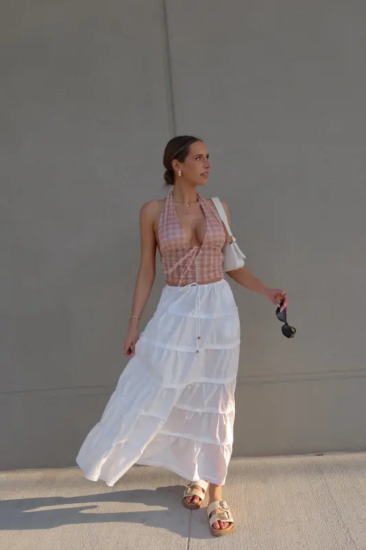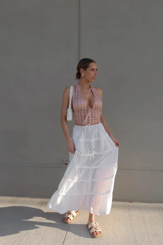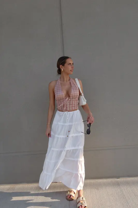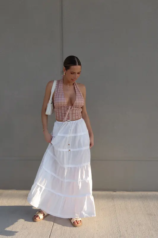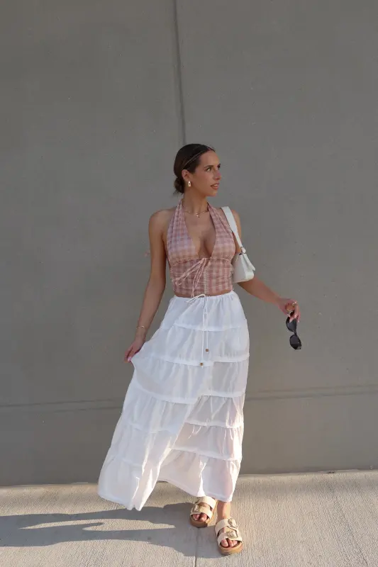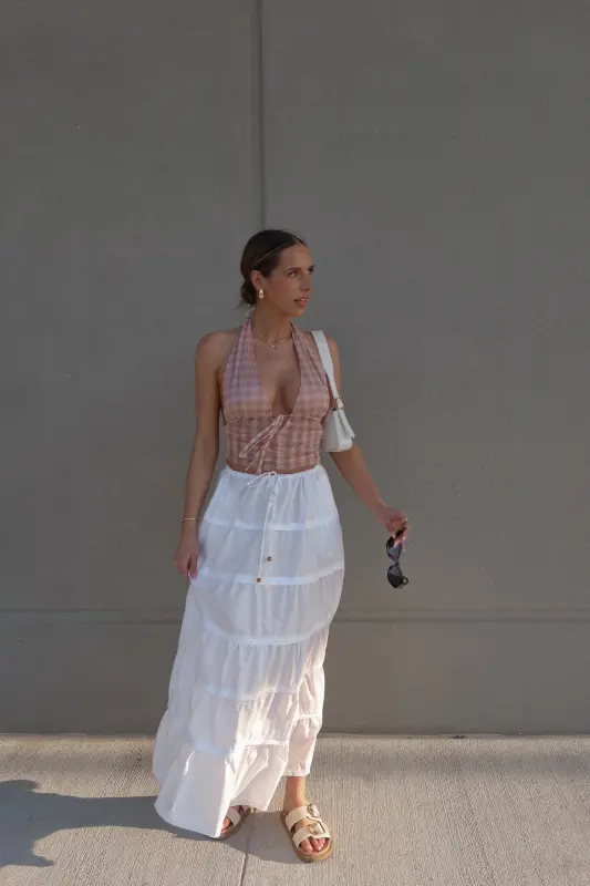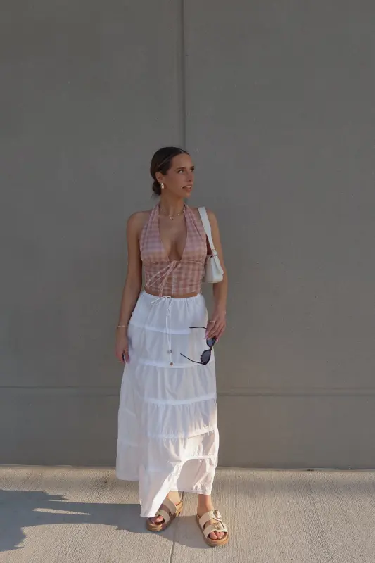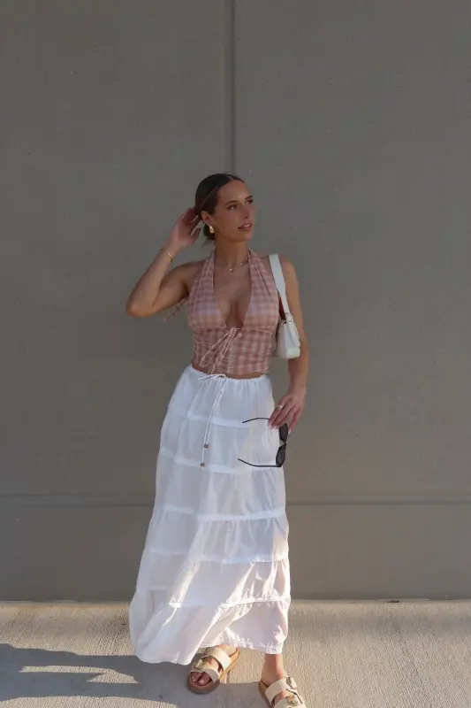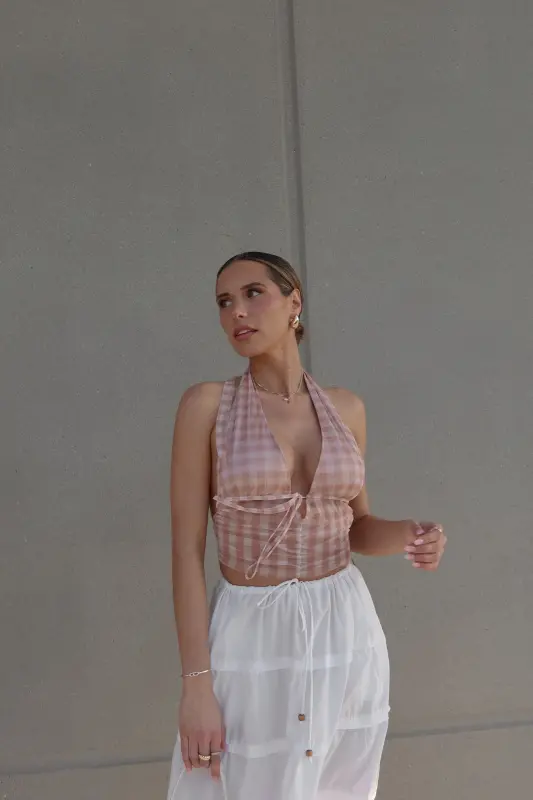 Presenting our Chesley Peach Checkered Halter Top, a stylish addition to your wardrobe featuring a trendy checker print design. With its self-tie neck detail and adjustable bust tie, this top offers a customizable fit that accentuates your curves. The fully lined bust provides comfort and coverage, while the stretchy ruched mesh bodice ensures a flattering silhouette. Complete with a cropped fit and hidden side zipper closure, it's the perfect choice for effortlessly chic looks.