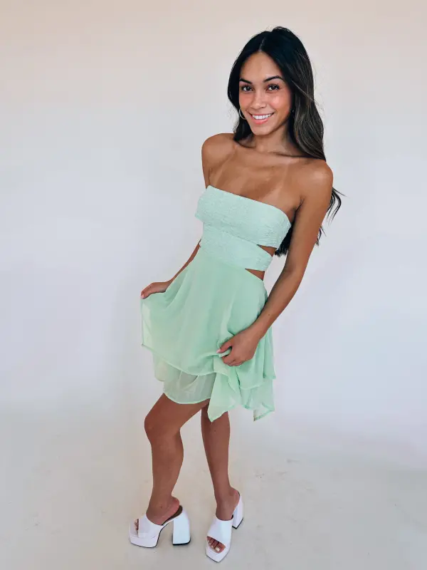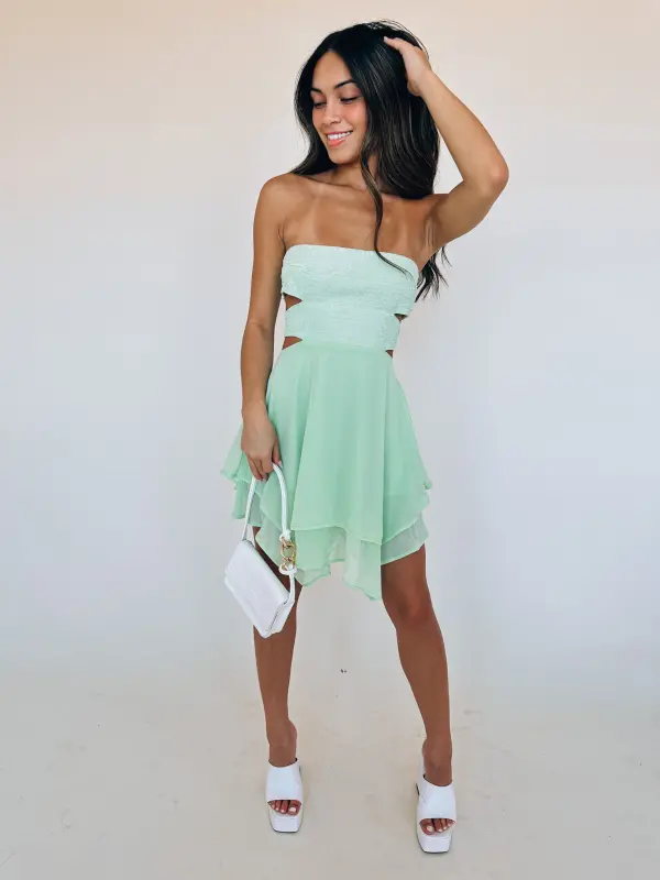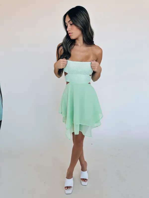 Our Dawsyn Cut Out Mini Dress is a perfect date night dress! This dress is strapless dress with no slip grip, and side keyhole details. This dress features a texture top with two side cutouts, smocked material across the midback, and open back with a metal clasp closure. The skirt is flowy with layered chifon material that is lined. This dress is true to size and has stretch throughout.