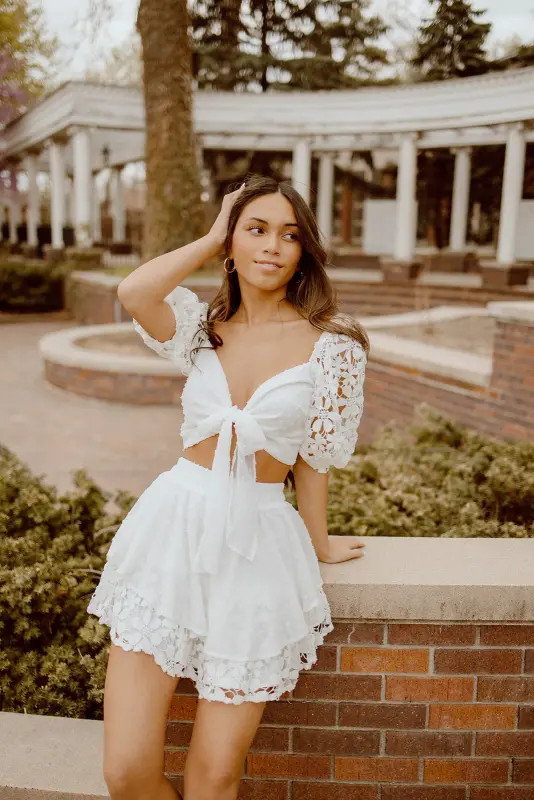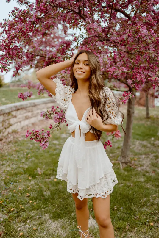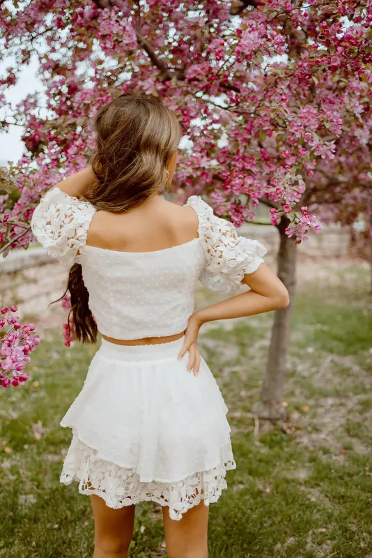 Our Emma Textured Setfeatures a cropped short sleeve top and fit and flare mini skirt. The top included in this set features a self tie bustline and eyelet short sleeve. The skirt of this set has a high waisted elastic wasitline fit and also features a tiered look with eyelet details throughout. This set also features a unique swiss dot textured material all throughout which gives this set a very elevated look. This set is true to size and fully lined.
