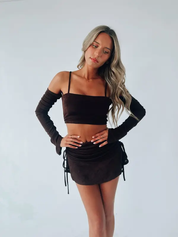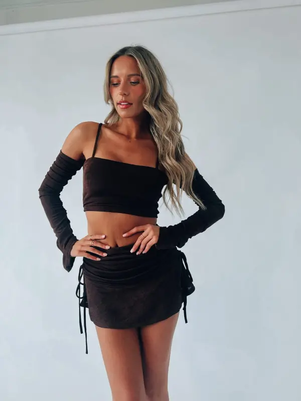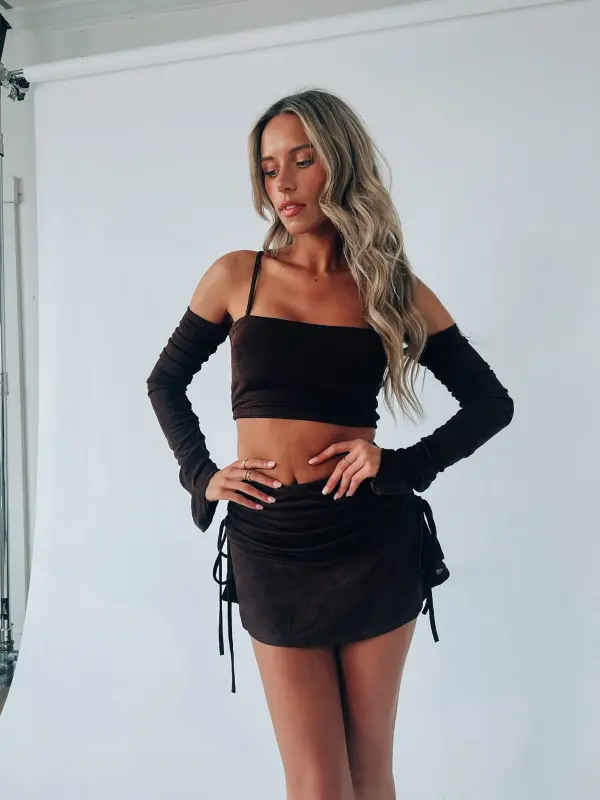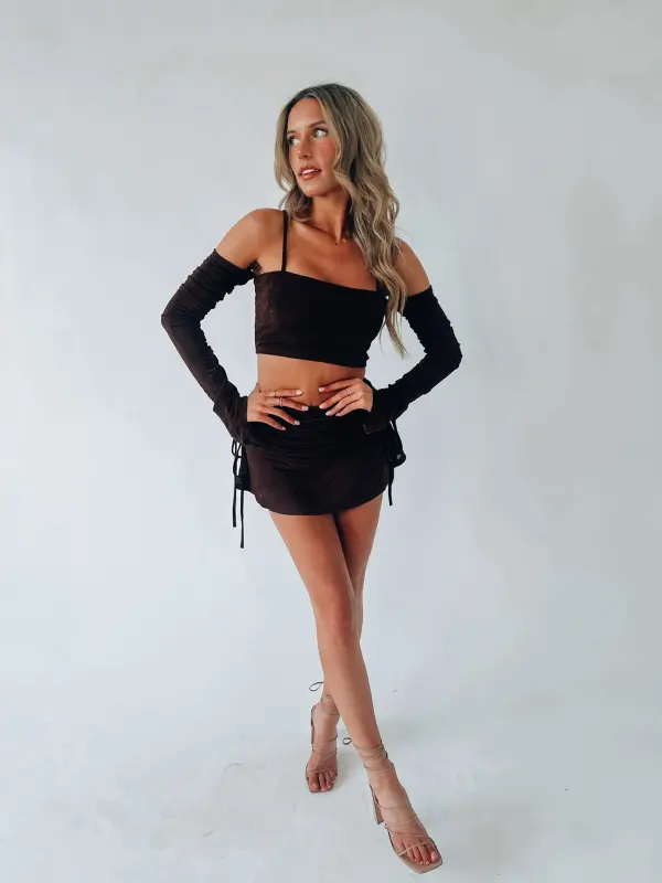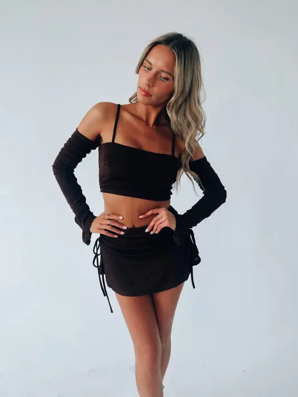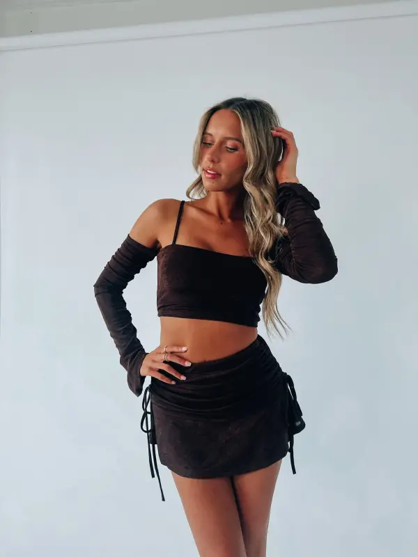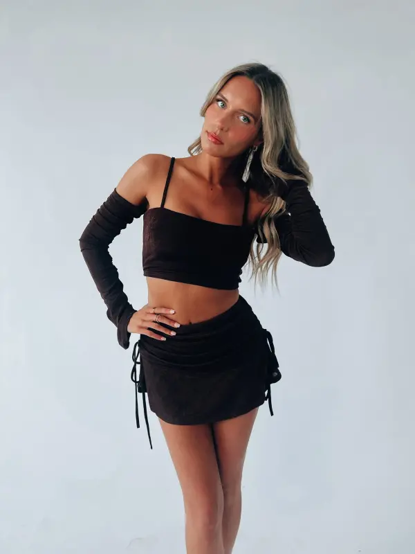 Our Jaiya Skirt Set is a skirt and top set that is loaded full of details. The top in this set is a fitted crop top with a square neckline with adjustable with back strap detail. This set is very stretchy and is fully lined for additional structure. The skirt includes hidden shorts, thick elastic waistline, cinchable side detail to create a more customizable fit ,and ruffle hemline.