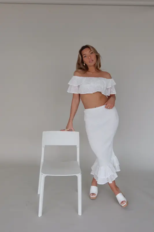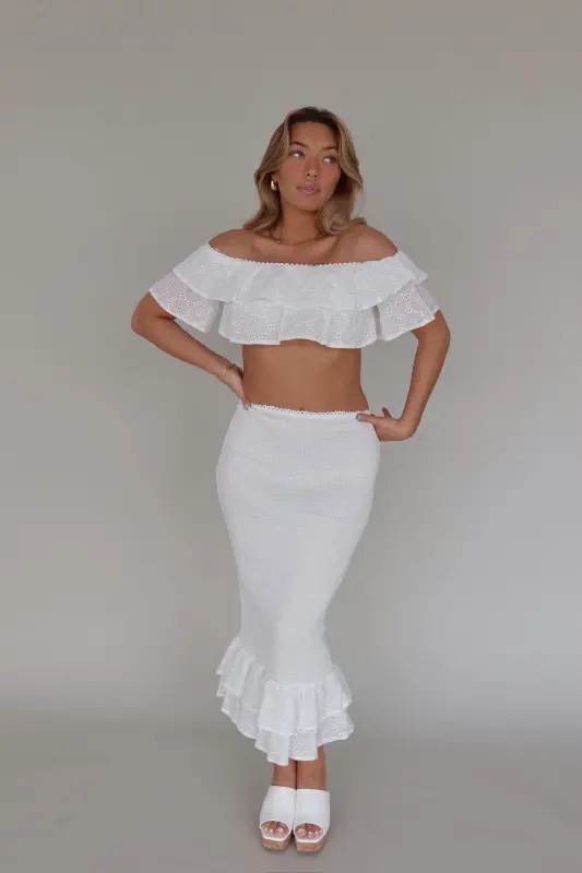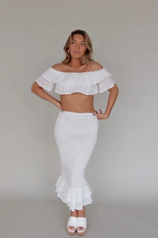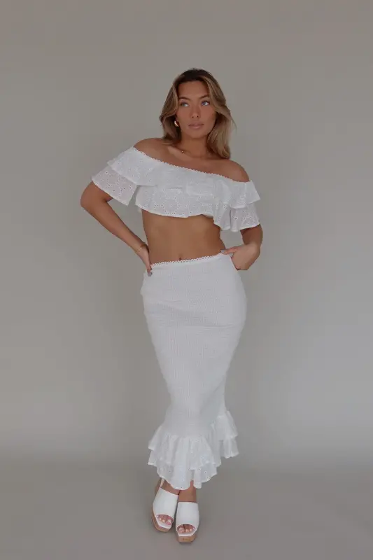 Unveiling our Lace Eyelet Top and Midi Skirt Set, a captivating duo that embodies sophistication and style. This stunning textured set features an off-the-shoulder style lace eyelet tiered ruffle cropped top, creating a romantic and feminine silhouette. The tiered ruffle detail extends over the shoulders, adding a touch of drama to your look. Paired with the top is a midi-length skirt, boasting a fitted smocked design that accentuates your curves beautifully. The skirt is finished with a playful ruffled two-tiered hemline, adding movement and flair to your outfit. Crafted with stretch fabric, this set ensures a comfortable and flattering fit true to size. Elevate your style with the Lace Eyelet Top and Midi Skirt Set, perfect for any special occasion or casual outing.