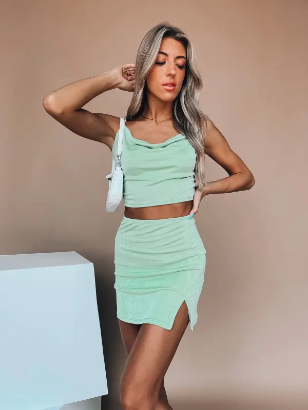 - Features: Fitted mini skirt and crop top, cowlneck, adjustable self-tie straps, back zipper closure, fitted silhouette