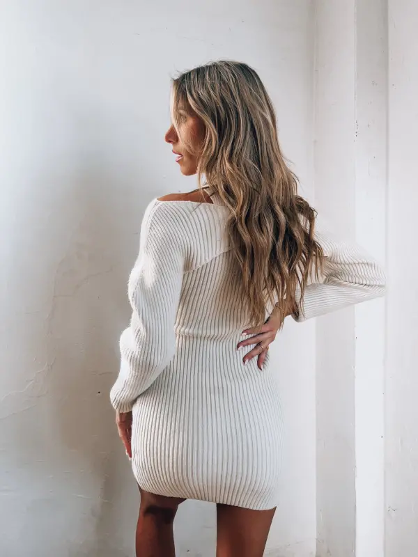 Our Mila Knit Dress is a dress set that is completed with a fitted knit mini dress with a mockneckline and detatchable knit long sleeve shrug. This dress is so versatile and can be worn many ways. The shrug of this can be worn on or off the shoulders or can be taken off and the dresss can be worn alone. Both the dress and the shrug of this dress are made of thick stretchy material to give the dress a more comfortable fit while keeping the structure intact. While the dress has a bodycon style fit the shrug has a slightly oversized fit. This dress does run true to size
