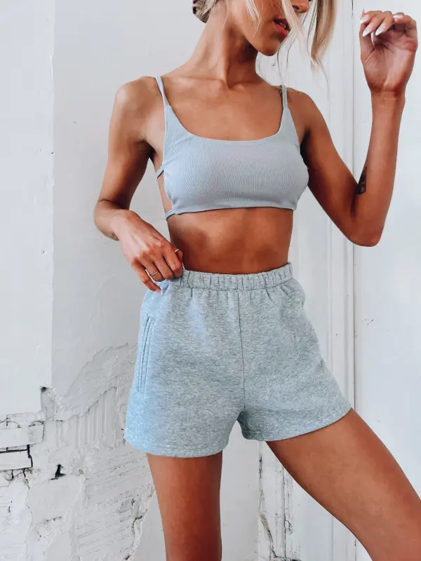 Our Moody Grey Shorts Set has a cropped spaghetti strap ribbed tank with an open back keyhole feature. The shorts are a sweatpant material with two side pockets and a thick waist band.