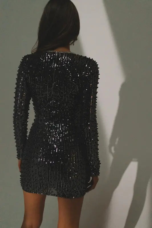 Our Show Stopper Black Sparkle Mini Dress is a long sleeved fitted mini dress that has a deep v-neck neckline. This dress has a sequin and pearl detail all over the fabric and the inside of this dress IS LINED with a soft to the touch fabric. The back of the dress is completed with a back zipper closure with a hook and eye clasp. This is the perfect Holiday dress for a night on the town!