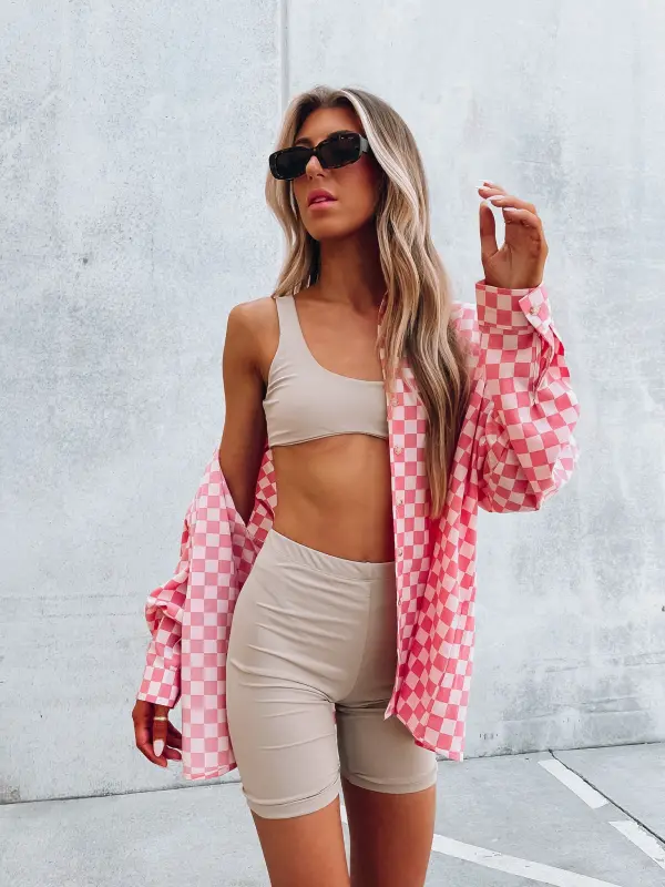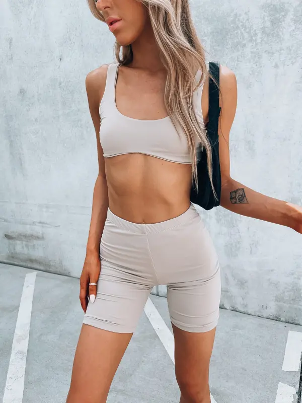 Our Street Style Biker Shorts Set is a very comfy set. This sporty set comes with a cropped bra top and biker shorts.. The shorts have an elastic waistband.