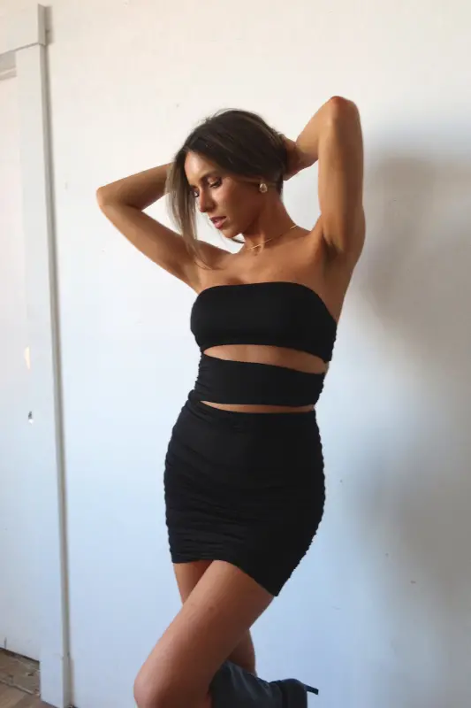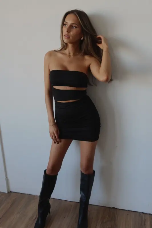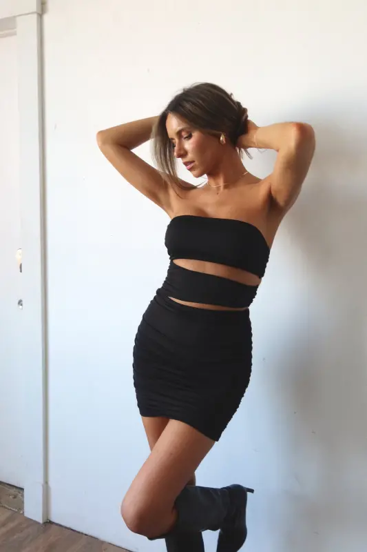 Our Tia Cut Out Strapless Dress is a bodycon dress with cut out details. his dress is completed with a small cut out below the bustline. The cut outs are connected with clear straps. This dress has plenty of stretch and runs true to size.