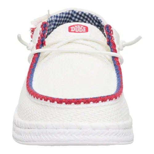 Let freedom ring with the Wendy Espadrille Americana - a cool, festive look that takes on ultra HEYDUDE™ comfort. Designed with a breathable, textile upper, a waffle textured heel with colorful tassels and elastic laces to slip on and off with ease. Finished off with a lightweight, espadrille inspired outsole and plenty of warm weather vibes.